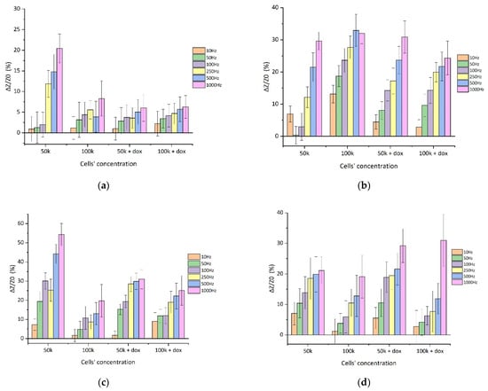 ΔZ/Z0 (%) for cell lines before and after treatment with the anticancer agent doxorubicin in two different population densities (50 K cells and 100 K cells/500 μL) in five different frequencies (5, 10, 100, 250, 500 and 1000 Hz): (a) SK-N-SH; (b) HeLa; (c) MCF-7; (d) MDA-MB-231.