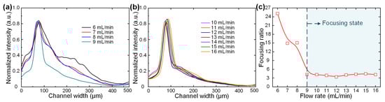 (a,b) Normalized fluorescence intensity profiles across the channel width at flow rates of (a) 6–9 and (b) 10–16 mL/min. (c) Focusing ratios at increasing flow rates. Particles were regarded as in focusing state in the device after the flow rate reached 9 mL/min.