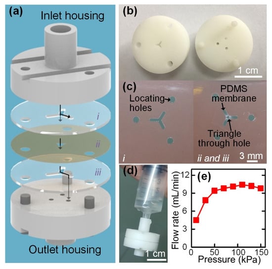 When pushing the syringe by hand, the generated flow rates may inevitably vary during the pushing process. Although the four-channel paralleled concentrator can operate over a board flow rate range of 9–16 mL/min, it is still challenging to manually push the syringe to generate the desired flow rate within this range. Noteworthy, a flow rate that is too high or too low will deteriorate the concentration performance. To enable the concentration performance to be totally independent of the experiences and operations of the users, a syringe-tip flow stabilizer (Figure 4a–c) was integrated with the four-channel paralleled inertial microfluidic concentrator to stabilize and regulate the flow generated by hand pushing the syringe. The flow-stabilizing actuator was fabricated by stacking two layers of double-sided tapes (i and iii) and one layer of PDMS membrane (ii) in the order of tape–PDMS–tape (Figure 4a). The locating holes in each layer were used to precisely align the different layers. The two layers of double-sided tape were patterned with three branching channels. After transferring the PDMS membrane onto one surface of the double-sided tape, a triangular through hole was cut on the PDMS membrane in the central region of the three branching channels (Figure 4c and Figure S4).