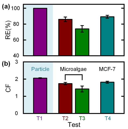(a) Recovery efficiency (RE) and (b) concentration factor (CF) of 10 μm standard-sized particles, microalgal cells, and MCF-7 tumor cells under different experimental tests (T1−T4). Tests T1, T2, and T4 were performed with the integrated device using 10 μm standard-sized particles, microalgal cells, and MCF-7 cells, respectively. Test T3 was a control experiment on the concentration of microalgal cells using a device without a flow stabilizer. All the experiments were repeated five times under the hand-operated mode. The error bar in this figure denoted the standard deviation.