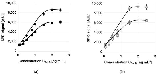 Typical analytical characteristics of the biosensors—calibration graphs, linearity range, precision, recovery, and limits of detection and quantification—were investigated. The concentration of pepstatin A used as a receptor was selected as 500 ng mL−1, based on a study by Gorodkiewicz and Regulska [33], and the optimum pH was taken as 3.75. Calibration graphs were investigated within the range 0.1–2.5 ng mL−1. The results are shown in Figure 2 for the biosensors based on pure gold (Figure 2a) and on Ag/Au chips (Figure 2b). Typical Langmuirian curves were obtained, with a plateau and an approximately linear section. Slight differences are visible between the biosensors based on chips covered with adhesive foil (circles) and those covered with two photopaints (squares).