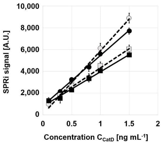 The difference in the slopes of the straight sections of the calibration graphs (see Table 2) has no real practical significance for the determination of Cath D in serum. Cath D serum concentration exceeded the range of dynamic response for all curves, and samples had to be adequately diluted with acetate buffer (pH 3.5) to fit the corresponding calibration curve. Thus, there is no reason to conclude in this case that the biosensor whose calibration graph had the highest slope (that based on Ag/Au with adhesive foil) was the best. However, in the determination of other analytes with lower concentrations in blood, the higher slope for the biosensor based on Ag/Au with adhesive foil may be significant. It is worth mentioning that the range of linearity can be extended by using the logarithm of concentration vs. the SPRi signal, instead of the concentration vs. the SPRi signal.