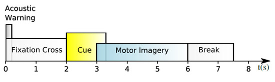 It is one of the most used datasets in EEG-based MI classification. It is a publicly available dataset that was collected from nine subjects using 22 EEG electrodes at a sampling rate of 250 Hz. Then, it filtered using a bandpass filter between 0.5 and 100 Hz [35]. Furthermore, three extra electrooculography (EOG) channels were employed to collect data on eye movement. Four classes of imagined movements are contained in the dataset, each representing a different bodily part: left hand, right hand, feet, and tongue. Two sessions were recorded on different days from each subject. The first session was used for training purposes, whereas the second was used for testing purposes. Trials polluted with artifacts were excluded from each session’s 288 trials. All of the participants were seated in front of a computer screen on an armchair. A fixed cross appeared on a black screen at t = 0 for each trial, accompanied by a short warning tone to signify the start of a trial. A cue emerged in the shape of an arrow after two seconds (t = 2), pointing in the direction of one of the four classes: left means the left hand, right means the right hand, down means feet, and up means tongue. The arrow stayed in place for 1.25 s, prompting the subject to complete the desired class. When the fixed cross on the screen vanishes, this means that the subjects can relax and the trial is finished. Each trial was followed by a 2-s pause in which the screen was black. Figure 2 depicts the timing pattern for each trial.