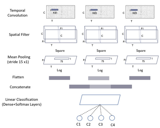 After defining the three kernel sizes, and tuning the hyperparameters by implementing the basic models (EEGNet and ShallowConvNet), we follow the multibranch models. Those models take the raw EEG signal without any significant preprocessing as input, and contain three branches of deep learning networks, each with different kernel sizes. Then, we concatenate the output, and feed it to the softmax layer. The architecture of those models is shown in Figure 5 and Figure 6, respectively.