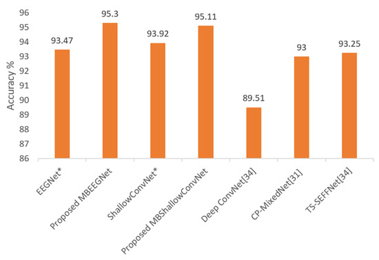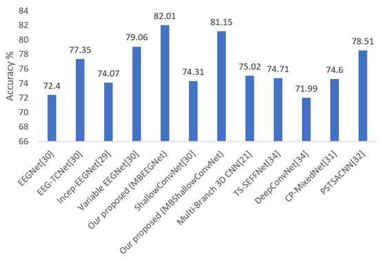 The average classification accuracy of our proposed models (MBEEGNet and MBShallowConvNet) compared with the fixed EEGNet, EEG-TCNet, Incep-EEGNet, variable EEGNet, Multi-Branch 3D CNN [21], TS-SEFFNet [34], DeepConvNet [34], CP-MixedNet [31], and parallel spatial-temporal self-attention CNN (PSTSACNN) [32] are shown in Figure 7. The proposed models have an accuracy of at least 6.13% higher than the most competitive networks, as seen in the graph.