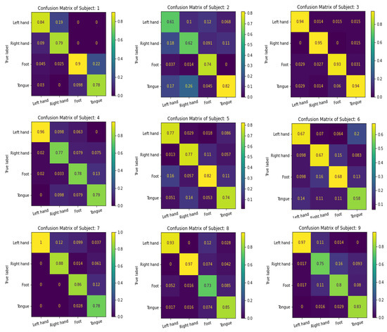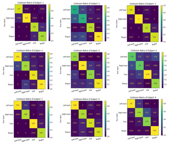 We use the confusion matrix to test the efficiency of the feature extracted by the proposed multibranch models MBEEGNet and MBShallowConvNet, and the results for the nine subjects in the MI BCI IV-2a dataset are shown in Figure 8 and Figure 9.