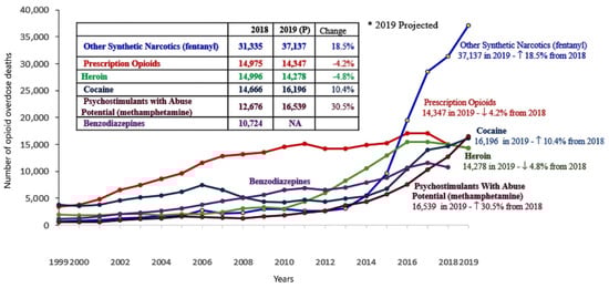 The number of fentanyl, fentanyl analogs, and other opioid overdose deaths in 1999–2019. Reprinted with permission from ref. [] under Creative Commons Attribution License 4.0, 2021.