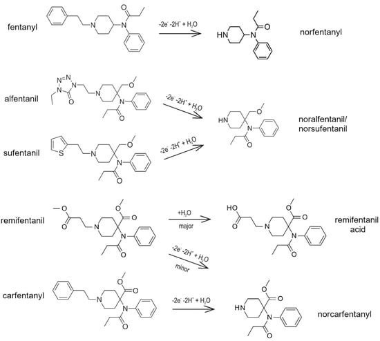 Figure 3 presents the proposed mechanism of metabolism of fentanyl and its four medicinally-used analogs (alfentanil, sufentanil, and remifentanil) and veterinary medicine (carfentanyl).