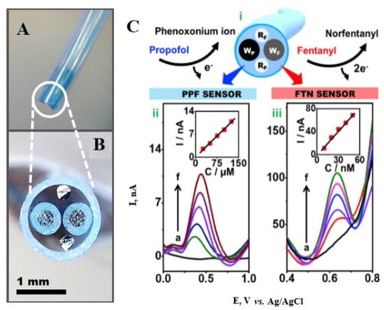 SWV with a microcatheter-based dual-analyte sensor was capable of simultaneous real-time continuous monitoring of fentanyl and propofol drugs. It was enabled by quite a low cross-reactivity between these two analytes. The high selectivity of this detector was tested by the addition of common interfering compounds []. The proposed method proved to be sufficiently sensitive for analytical purposes with low LODs for fentanyl and propofol (2.18 nmol L−1 and 4.3 µmol L−1, respectively; Figure 5). Moreover, the sensor is fast to use, selective, exhibits wide LDRs in the cases of both analytes, and is sufficiently reliable. Good performance in the analysis of artificial plasma and untreated blood samples allows its use for real-time monitoring of anesthetics during surgical operations []. This arrangement demonstrates a huge potential of the application of simple electroanalytical methods in complex matrices for point-of-care use.