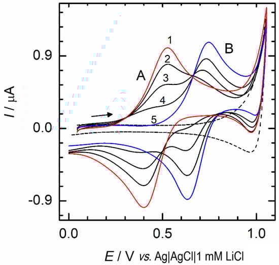 Cyclic voltammograms (10 mV s−1) measured using the IL membrane with 1 mmol L−1 LiCl (pH 7) in the absence (dashed line) and the presence (solid lines) of fentanyl (peak A) and norfentanyl (peak B) in the aqueous phase at the concentrations 200 and 0 (1), 150 and 50 (2), 100 and 100 (3), 50 and 150 (4), or 0 and 200 (5) μmol L−1, respectively. Reprinted with permission from ref. []. Copyright 2021 John Wiley and Sons.