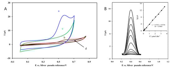 (A) CV of 1.3 × 10−4 mol L−1 sufentanil in 0.05 M NaCl on (a) MWCNTs-SPCE; (b) bare SPCE; (c) CV of blank at MWCNTs-SPCE; and (d) CV of blank at bare SPCE. (B) DP voltammograms of increasing concentrations of sufentanil (down to up: 0.064, 0.10, 0.15, 0.26, 0.52, 1.03, 1.55, 2.07, 2.60, 3.10, and 3.62 µmol L−1) recorded under optimum conditions. Inset: Concentration dependence of sufentanil in water. Reprinted with permission from ref. []. Copyright 2021 Elsevier Science & Technology Journals.