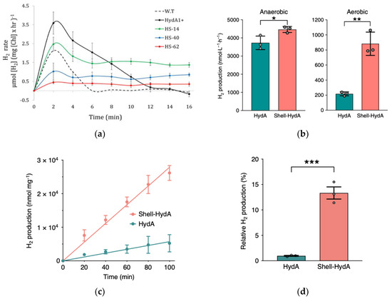 To protect the hydrogenase from O2 byproducts, Li et al., proposed the use of carboxysome shells, “virus-like” bacterial organelles that were shown to provide favorable microenvironments. Analysis showed increased ability for H2 catalytic performance especially when Escherichia coli were used as genetically modified hosts to allow encapsulation of [Fe-Fe]-hydrogenases and ferredoxin isolated from C. reinhardtii algae [41]. The potential of such complexes was proven in the increased enzymatic resistance to O2 as well as increased amount of produced with respect to free HydA, especially under aerobic conditions in vivo (Figure 1b). Moreover, difference in H2 production between the shell-HydA composite and free HydA increased over 100 min when tested in vitro, thus proving a sustained benefit to the enzyme technology (Figure 1c). Additionally, purified shell-HydA complex maintained 13.33 ± 2.06% of the activity following O2 exposure when compared to only 0.97 ± 0.15% activity observed for the free enzyme (Figure 1d). The encasement allowed for the hydrogenase complex to be more selectively permeable to substrates thus leading to improved enzymatic activity [41].