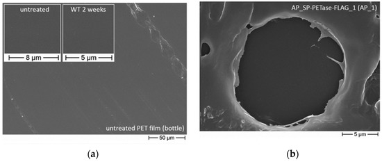(a) Untreated PET film, as seen via scanning electron microscopy, and representative of the standard, smooth surface of a PET-based bottle film. Reprinted with permission from ref. [43]. 2019 Springer Nature. (b) Scanning electron microscopy analysis of PET bottle film following five weeks of exposure to and subsequent degradation by cells expressing ; degradation is shown as a sign of wear. Reprinted with permission from ref. [43]. 2019 Springer Nature. (c) Plots corresponding the total sum of the concentration of PET degradation products with time following the respective nanoplastics’ and microplastics’ incubation with IsPETase and DuraPETase. Reprinted with permission from ref. [45]. 2021 American Chemical Society.