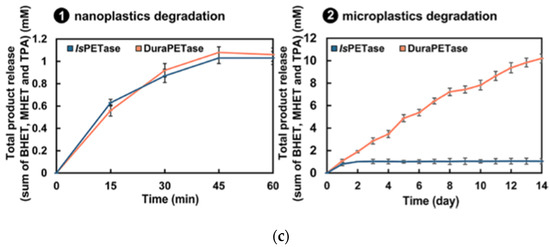 Further, Cui et al., applied the greedy accumulated strategy for protein engineering (GRAPE) to improve the robustness of a PETase isolated from Ideonella sakaiensis (IsPETase) [45]. Both DuraPETase and IsPETase caused total nanoplastic degradation following treatment for 1 h at 37 °C, according to collected high-performance liquid chromatography data (Figure 2c (1)). As for microplastics, DuraPETase was able to breakdown the larger particles to close to completion within two weeks, displaying water treatment activity much greater than those of IsPETase (Figure 2c (2)).