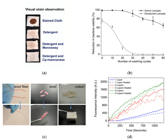 (a) Observation of chocolate stain removal as a result of enzyme and non-enzyme containing detergent washes. Reprinted with permission from ref. [4]. 2019 The Authors. (b) Comparison of active and denatured laccase enzymes in their antibacterial capacity, as represented by percent reduction in bacterial viability. Reprinted with permission from ref. [5]. 2018 Elsevier. (c) Visual representation of wool and cotton textile samples before and after self-healing. Reprinted with permission from ref. [6]. 2016 American Chemical Society. (d) Efficiency of enzymatic activity, as represented by fluorescence intensity, of multilayer systems both before and after the self-healing process. Reprinted with permission from ref. [6]. 2016 American Chemical Society.