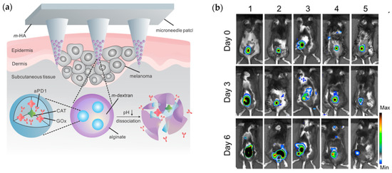 Enzyme immobilization has the potential to serve as targeted, effective, and efficient system that aids in drug delivery while eliminating possible unwanted biological entities, reactions, or processes associated with drug adsorption and metabolization at a tumor site [16]. For instance, enzymes glucose oxidase (GOx) and catalase (CAT) were used as components to a microneedle (MN) patch for a minimally invasive transdermal melanoma treatment (Figure 4a). The nanoparticles placed at the tips of the microneedles were spherical in shape and had an average hydrodynamic size of 250 nm. The patch was formed from HA crosslinked with N,N-methylenebis (acrylamide) (MBA) under photo initiator and UV-initiated polymerization respectively, and had a 9 × 9 mm2 area containing 225 cone-shaped MNs. Encapsulated GOx converted glucose to gluconic acid, producing an acidic environment that promoted the gradual release of anti-programmed death-1 (aPD1) previously encapsulated within dextran nanoparticles (NPs) to be used for skin cancer immunotherapy. Functionally, aPD1 was shown to help negate the negative effects to immunity caused by programmed death-1 receptors of T-cells [15].