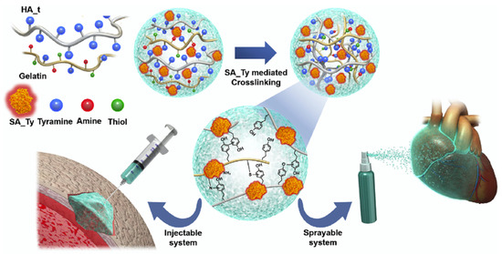 Visualization of the development of an HA-based, injectable and sprayable formula to be applied in tissue engineering as a post-surgical tissue adhesive and encouragement for cellular recruitment to damaged tissue. Reprinted with permission from ref. [18]. 2018 Elsevier.