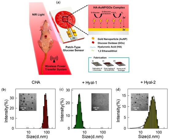 (a) Fabrication and application of a wireless glucose sensor used to test sweat for glucose concentration and consisting of an HA-AuNP/GOx complex casted on an electrode surface. Reprinted with permission from ref. [22]. 2019 American Chemical Society. (b–d) TEM imaging and size distribution corresponding to a 10 μg/mL solution of CHA without the addition of any hyaluronidase, CHA with 20 μg/mL Hyal-1, and CHA with 20 μg/mLHyal-2, respectively. Reprinted with permission from ref. [24]. 2019 American Chemical Society.