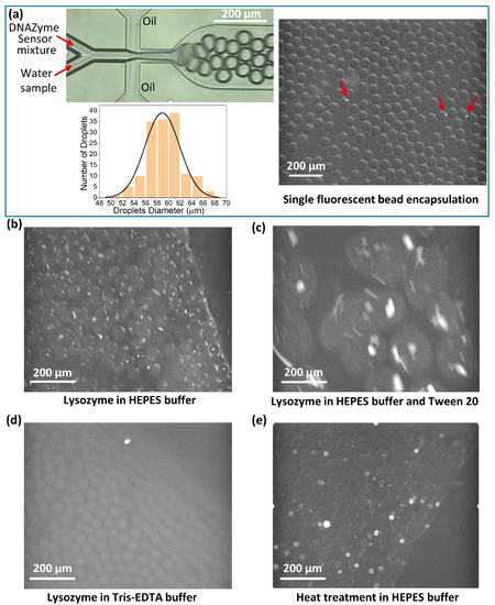(a) Production of water droplets using the microfluidic device and encapsulation of fluorescent beads into the droplets. (b–d) Lysozyme (1 mg/mL) used in different buffer systems for bacterial cell lysis. (e) Cell lysis in HEPES buffer due to heat treatment at 105 °C.
