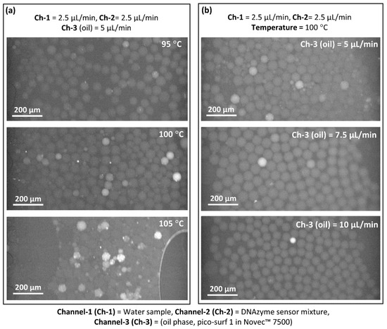 As shown in Figure 1, the as-produced droplets directly pass through the heating stainless tube (shown red) placed on the hotplate. Therefore, the change in temperature and flow rate of the fluids are important parameters to optimize. Figure 3a shows the heat treatment of the droplets at different temperatures while keeping the flow rate of all the fluids constant. It can be seen that heating at 95 °C (Figure 3a and Video S7, Supplementary Materials), a weak fluorescent signal was observed in the droplets, which cannot be recognized distinctively as the droplets containing E. coli compared to the empty droplets (droplets without E. coli). This may be due to the insufficient bacterial cell lysis at this temperature. Typically, in the case of bulkbacterial lysis, heating at 65 °C for 30 min was enough for lysis [23]. However, higher temperatures are needed as the fluid passes through the heating tube in a continuous flow manner. Heating at 100 °C gave a clear detectable fluorescent signal compared with the empty droplets (Figure 3a and Video S8, Supplementary Materials). Heating at a higher temperature, 105 °C (Figure 3a and Video S9, Supplementary Materials), resulted in larger and smaller droplets due to the instability of the emulsion at this higher temperature. Therefore, 100 °C was selected as the optimum temperature.
