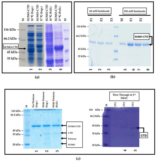 Expression of SUMO tagged protein was conducted at 37 °C for 3 h in terrific broth (TB) medium under 220 rpm agitation. These conditions resulted in the protein being in its insoluble form (Figure 1a). To resolve this issue, the expression temperature was decreased to 18 °C for 20 h (Figure 1a). The amount of IPTG for expression remained at 0.5 mM. With these conditions, a fairly good amount of SUMO-muRif1-CTD protein was obtained in the soluble portion of the cell lysate (supernatant), and this amount seemed to be sufficient to further experiment with this protein.