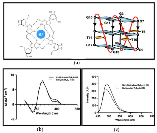 It was expected for the T6G24 sequence to form a parallel G4 structure (Figure 2a). Results for G4 formation analyses of the biotinylated nucleotide sequence are presented in (Figure 2b,c). Biotinylation did not affect the G4 formation, and in the presence of this tag, the G4 structure was formed.