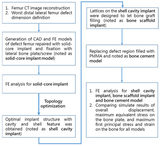 A study flowchart of the sequence of FE analysis and in vitro biomechanical fatigue testing is shown in Figure 2. Before performing implant optimization analysis, it was necessary to conduct mechanical simulations according to the position of the solid-core implant in the distal femur. First, the CT image of the femur of a 12-year-old boy was imported, and a CAD model of the femur (including the corresponding cortical bone and internal cancellous bone) was constructed using Geomagic image processing software (Geomagic Studio, v12, Geomagic Inc., Morrisville, NC, USA). CAD software (PTC Creo, V6.0, PTC Inc., Needham, MA, USA) was used to cut out the distal femoral defect area conforming to the LW defect to generate a “solid-core implant” model of the corresponding defect. The distal and proximal ends of the solid-core implant were designed to lock and fix the implant to the femur with screws (diameter, 3.5 mm; length, 30 mm). The corresponding bone screw-plate fixation system (Tedray locking bone plate system, Quanwei Precision Co., Ltd., Taichung, Taiwan) was constructed on the lateral femur (Figure 3).