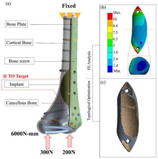 (a) Loading, boundary conditions, and material distribution of FE analysis for distal femur repaired with metal implant and external bone plate; (b,c) the result of topology optimization of the implant.