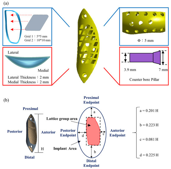 To allow for the insertion of bone graft material into the implant, lattices were cut into the implant outer surface (Figure 5a). Generalizable design rules were set using dimensions a, b, c, and d of the implant (Figure 5b) to indicate distances from the lattice region to the bone surface boundary. These distances were defined relative to the implant length H as H = Y/3, where Y is the femur length (Figure 1). Most of the surface lattice was a 5-mm × 5-mm grid; a larger 10 mm × 10 mm grid was used for the larger bone, and the grid compartments were separated by 2-mm–wide stents. A number of 5-mm–diameter circular holes were made on the implant surface contacting the bone (inner side) to allow for bone growth. A counter hole was used where the fixing implant screw passes through the implant so that the screw lies flat on the implant surface when locked.