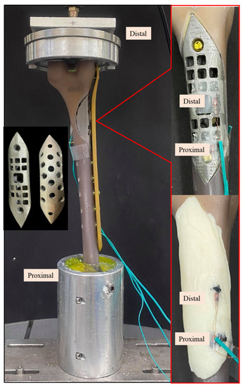 Experiments were conducted in triplicate for each repair type, using 3 femurs repaired with a bone scaffold implant and 3 repaired with bone cement (Copolymer Bone Cement, Zimmer Inc., Warsaw, IN, USA). Strain was measured using two uniaxial strain gauges (Strain gauge N11, Showa Measuring Instruments, Tokyo, Japan) attached to the surface of the samples, as shown in Figure 6. After the implant was fixed to the composite femur, the bone screws (proximal: diameter, 5 mm; length, 26 mm; distal: diameter, 5 mm; length, 60 mm) and bone plate (length, 236 mm) were installed on the lateral surface (Tedrui locking bone plate system, Quanwei Precision Co., Ltd., Taichung, Taiwan). The proximal end was embedded and fixed onto the machine (Instron E3000, Instron, Canton, MA, USA) to facilitate the application of distal force, and the proximal and distal strain gauges on the bone scaffold implant/bone cement were connected to the mechanical strain measurement system (cDAQ 9178, NI Inc., Cary, NC, USA). The force was applied in nine stages (A–I) of increasing cyclic load (20,000 cycles/stage) (Table 2). The load was incrementally increased from 0.5–1 times the body weight to 0.5–5 times the body weight. At the end of one stage, the next stage began immediately, and each sample was subjected to 180,000 cycles in total. Finally, the changes in strains at the implant surface with the phased cyclic load was compared between the bone scaffold implant and bone cement. Measurements in response to load bearing were recorded every 5000 cycles; a total of 36 data points were taken for each sample.