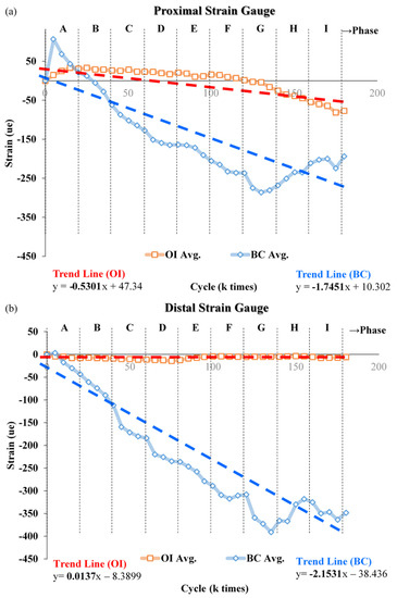 The trends in strain with increasing load on repaired composite femurs in cyclic load tests are shown in Figure 8. The increase (negative) in proximal strain with increasing load stages was greater in the femur repaired with bone cement than with the bone scaffold implant, as indicated by the trend lines in Figure 8a. The slope of this line for bone cement was about three times that of the bone scaffold implant. The rate of change in distal strain in response to increasing load stage was clearly greater for the femur repaired with bone cement than with the bone scaffold implant, the trend line for which had a slope of approximately 0 (Figure 8b).
