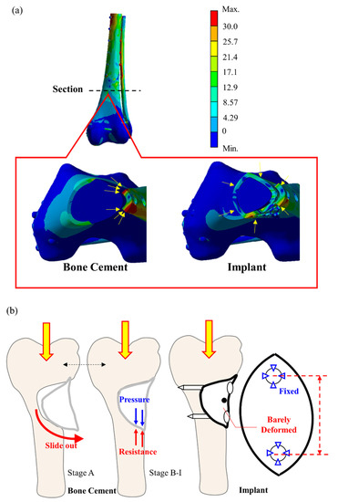 The application of these calculations to determine the stress on the bone cement model and the implant is shown in Figure 9. In the bone cement model, the elastic modulus difference between the bone cement and Ti6Al4V is as high as 43 times, such that the stress is primarily borne by the external Ti6Al4V bone plate for the femur defect repaired with bone cement. Stress concentration did not occur in the bone cement region but was found at the bone plate (yellow arrow in the Figure 9a left). The stress was transmitted from the proximal bone screw to the external plate and back to the bone via the distal bone screw. This phenomenon induced high stress and strain in the bone surrounding the bone screw (Figure 7c,d). In contrast, for the bone scaffold implant, also made of Ti6Al4V, the bone plate stress was shared by the bone scaffold implant and transmitted through the implant in the defect area (Figure 9a). Therefore, no excessive stress concentration was present around the screw hole. This difference in load bearing between the implant and bone cement accounts for the marked difference in stress experienced by these materials. Thus, the bone scaffold implant is a more effective defect filler than is bone cement.