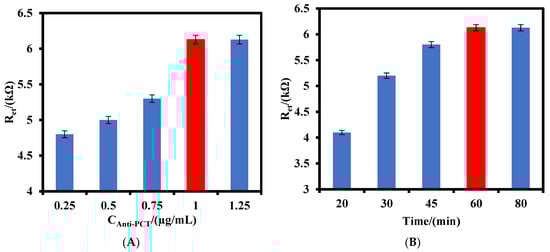 The effect of the anti-PCT antibodies value and incubation time on the response of the IDGE/Aunano/3-MPA/Anti-PCT/BSA to 800 pg/mL PCT antigen were investigated. As shown in Figure 4A, the Ret of the immunosensor increased as the anti-PCT antibody concentration increased from 0.25 µg/mL to 1.0 µg/mL and after that the signal remained constant, indicating the maximum value of the anti-PCT antibodies could be immobilized on the electrode surface was 1.0 µg/mL. The effect of the incubation time on the response of the immunosensor was also studied (Figure 4B). As can be seen, the response of the immunosensor to 800 pg/mL PCT antigen kept increasing up to 60 min and did not change after that, indicating the interaction of anti-PCT antibodies and PCT antigens reached a steady state. Therefore, 1.0 µg/mL of anti-PCT antibodies was used for the fabrication of the immunosensor, and 60 min was selected as the optimized incubation time between the anti-PCT antibody–PCT antigen during the investigation.
