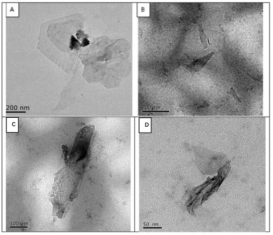 TEM of (A) BPNSs and (B–D) PLL−BPNSs. The dark-colored background of (B–D) is polylysine.