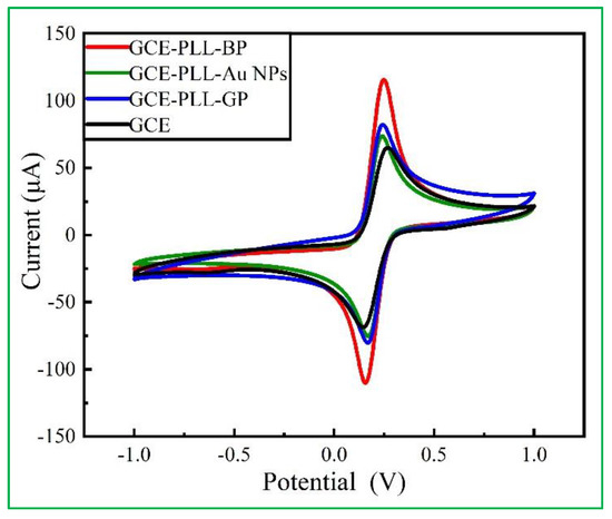 It is well known that graphene (GP) and AuNPs are traditional nanomaterials that are widely used in electrochemical sensors, due to their large specific surface area and high conductivity. In order to confirm that black phosphorus nanomaterials have better electron transfer performance compared with other nanomaterials, PLL-BP, PLL-AuNPs, and PLL-GP were obtained by mixing the same concentration of polylysine with the same mass concentration of black phosphorus nanosheet dispersion, gold nanoparticle concentrate, and graphene dispersion, respectively (this mass concentration is calculated from the absorbance of the dispersion). The GCE was modified with these three composite materials, respectively, and completely dried under argon environment. Cyclic voltammetry (CV) was used for characterization in the K3[Fe (CN)6] mixture system. As shown in Figure 3, the redox peak currents of three composite modified GCE are higher than the bare electrode, but that of PLL-BPNSs/GCE (red line) was much higher than the bare and PLL-Au NPs/GCE, PLL-GP/GCE for K3[Fe (CN)6] probe, and the peak potential difference (ΔE) was minimum. This means that the PLL-BP modified electrode surface was conducive to the transmission of probe ions on the electrode surface, and the conductivity was greatly enhanced. Thus, it can be shown that, compared with other traditional nanomaterials, black phosphorus nanomaterials have more superior electronic transmission performance, and can be used as an outstanding sensor preparation material in the sensing design strategy for effectively increasing electrical signals.
