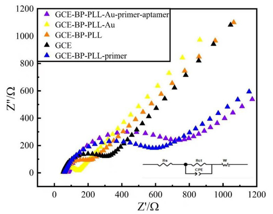 To investigate the interfacial transmission characteristics of the modified electrode, electrochemical impedance spectroscopy (EIS) tests were performed on GCE, PLL-BP/GCE, AuNPs/PLL-BP/GCE, primer/AuNPs/PLL-BP/GCE, and Apt/primer/AuNPs/PLL-BP/GCE in 10 mM PBS buffer containing 0.1 M KCl and 0.5 mM K3 [Fe (CN)6]. To match the experimental data, the Randles equivalent circuit model was employed, where Rs denotes the electrolyte resistance, Rct denotes the charge transfer resistance, C denotes the double capacitor, and W is the Warburg impedance. Generally, the semicircle diameter in Nyquist plots for the EIS is equal to the value of electron-transfer resistance (Rct). It can be observed from Figure 4. that the impedance value for the bare GCE decreased after modification by the PLL-BPNSs it decreased, which can be reflected by the reduction in the semicircle diameter (Rct) of the Nyquist curve. Due to the high electron mobility of the BPNSs, the electron transfer rate at the glassy carbon electrode interface increased, and the current hindrance decreased. After further modification with AuNPs, the electron transfer rate was further accelerated due to the huge quantity and large specific surface area of AuNPs, and the impedance semicircle diameter was further reduced. However, once the sulfhydryl primers were covalently modified to the electrode surface through Au-S bonds, the DNA primers were unable to transmit electricity, and the addition of DNA primers increased steric hindrance. This hindered the electron transfer, thus the measured impedance value for the electrode surface increased significantly. Finally, when the DNA primers were hybridized with free fipronil aptamers in the solution, the semicircle diameter of the Nyquist curve further increased, and the measured impedance was at maximum. This was because a specific combination of aptamers and primers further increased the steric hindrance of the electrode, and the sensor was successfully established and verified.