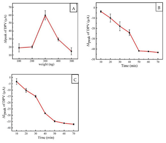AuNPs and thiol primers interact through the formation stably Au-S covalent bond. In this study, AuNPs were modified on the electrode coated with PLL-BPNSs composite to further amplify the electrical signal. The large specific surface area of AuNPs makes for stable binding with thiol primers. Different doses of AuNPs, 100, 200, 300, 400, and 500 ng, were, respectively, added to the prepared PLL-BP/GCE electrode surface and dried, and DPV measurements were performed with electrodes in the K3 [Fe (CN)6] mixed system. The results are shown in Figure 5A. As can be seen, the current increases with increasing amounts of AuNPs, reaching a maximum at 300 ng, followed by a montonic decrease as the amount of gold is increased. This is an indication that at more than 300 ng, the AuNPs form a thick layer, which results in a decrease in the peak current.