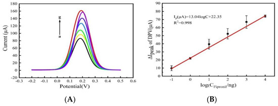 When the electrolyte solution contains fipronil pesticide, the fipronil aptamer can specifically recognize and capture fipronil in the solution, which makes the structure and morphology of the fipronil aptamer change. The binding of fipronil to aptamer generates the spatial conformation of aptamer. Due to the effect of spatial conformation, the aptamer is separated from the primer and results in the change of the surface state of the electrode. As a result, the electronic transmission obstacle decreases, and the peak current for the detection system increases. Figure 6A shows the current response of Apt/primer/AuNPs/PLL-BP/GCE to different concentrations of fipronil. The current gradually increased with increased fipronil concentration. The reason is that more aptamers were specifically bound to fipronil and separated from the primers with increased fipronil concentration, which accelerated the electron transfer on the sensor surface. As shown in Figure 6B, the logarithmic values for ∆IDPV and CFp for the fipronil aptamer sensor were positively correlated across concentration gradient of 0.1 ng/mL–10 μg/mL fipronil, and the sensor’s linear fitting equation was: ∆I (μA) = 13.04 logC + 22.35, with a linear correlation coefficient R2 of 0.998, and detection limit at 74 pg/mL (0.17 nM).