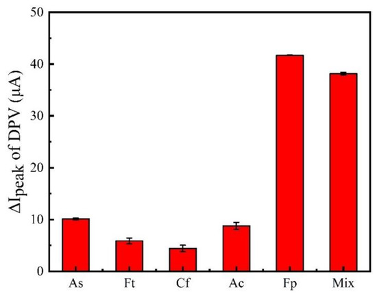 The sensor’s specificity is also critical. If the aptamer sensor matches, the detector’s specificity for fipronil must be confirmed using other pesticide interferents. The blank was the sensor without fipronil in PBS buffer, and 10 ng/mL aldicarb sulfoxide (As), fenitrothion (Ft), carbofuran (Cf), aldicarb (Ac), and fipronil (Fp) were employed in the test. For the specificity study, the aptamer sensor was incubated with the four pesticides listed above and a mixture (Mix) comprising the target assay (Fp) and the mixture. The specificity was assessed by the difference between the peak DPV of each pesticide compared to the blank. As seen in Figure 7, the experimental group containing fipronil solution and a combination of pesticides, including fipronil, exhibited much greater fluctuations in the DPV peak than the other pesticides, showing that the sensor has a greater selectivity for fipronil.