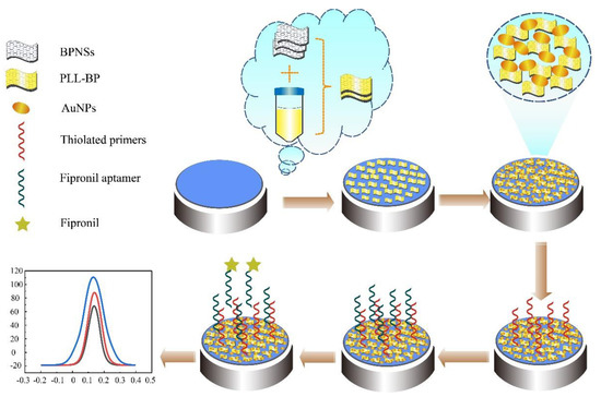 Pesticides have made significant contributions to pest control and agricultural output [1]. Fipronil (FP) is a very effective phenylpyrazole insecticide and is now widely used in agriculture [2]. FP is a process-targeted pesticide that has remarkable insect selectivity. However, inadvertent contact, incorrect use of FP, or widespread use of FP may pollute water and soil, causing a range of harmful consequences in animals and people, including neurotoxicity, hepatotoxicity, nephrotoxicity, and reproductive and cytotoxic effects in vertebrates and invertebrates [3,4,5,6]. Headaches, dizziness, sweating, and other symptoms have been described because of fipronil poisoning in humans [7]. Currently, the most common techniques for detecting fipronil are gas chromatography-mass spectrometry (GC-MS), liquid chromatography-mass spectrometry (LC-MS), and gas chromatography (GC) [8,9,10]. However, these traditional methods have challenges, such as complex sample pretreatment, high cost, and dependence on trained staff. As a result, it is critical to design a technique for detecting fipronil residues that is both quick and easy. Biosensors, as an alternate tool for pesticide detection, have received a lot of attention in recent decades. Electrochemical biosensors, as a cost-effective and portable analytical approach, overcome the limitations of traditional methods by providing high sensitivity, selectivity, and response time, as well as demonstrating significant potential in field tests. Black phosphorus nanosheets (BPNSs) are a new two-dimensional material with several distinguishing characteristics, including great biocompatibility, outstanding anisotropy and conductivity, high carrier mobility, and a programmable energy band gap [11,12,13,14]. BPNSs are often used for sensor preparation and application due to their great performance, and can be prepared by mechanical exfoliation, liquid exfoliation, chemical synthesis, and electrochemical exfoliation [15,16,17,18]. However, black phosphorus is unstable and easily degraded in air and water, and this degradation will be intensified under visible light irradiation, which also limits the application of black phosphorus [19]. The modification and functionalization of BPNSs improved the sensor’s stability, sensitivity, selectivity, and biocompatibility. Polymer poly-L-lysine (PLL) is a cationic polymer with good biocompatibility. The non-covalent electrostatic interaction between BPNSs and PLL not only retains the original wrinkled honeycomb structure of BP, but also enhances the stability and dispersion of BP in aqueous solution, which provides the possibility for preparation of stable biosensors [20,21].