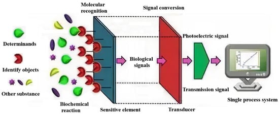 A biochemical sensor is a device that combines the biological recognition elements with appropriate signal transduction elements for a reversible and selective detection of the concentration or activity of biochemical substances in various samples. The International Union of Theory and Applied Chemistry (IUPAC) defines it as an analytical device for converting biological reactions or biological components into useful signals, which is composed of a molecular recognition part (sensitive element) and a conversion part (transducer) [,], as shown in Figure 1. When the molecular recognition element is specifically combined with the detected substance, the biological signal is converted into an optical or electrical signal through the transducer (such as a point electrode, photosensitive tube, field-effect transistor, piezoelectric crystal, etc.). Finally, the target substance is detected and analyzed with the instrument. In addition, a biochemical sensor can be divided into biosensors and chemical sensors according to the detection substance. The biosensor is an instrument that is sensitive to biological substances and converts their concentration into electrical signals for detection. It is made of immobilized biological sensitive materials as recognition elements, including DNA, proteins, cells, etc., while chemical sensors are instruments that are sensitive to various chemicals and convert their concentrations into electrical signals for detection, such as gases, ions, etc.