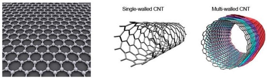 Basic structure of graphene (left), single-walled carbon nanotube (middle) and multi-walled carbon nanotube (right, the layers between the MWNTS are distinguished by different colors). Reproduced from Gookbin et al. [] by permission of Molecular Diversity Preservation International.