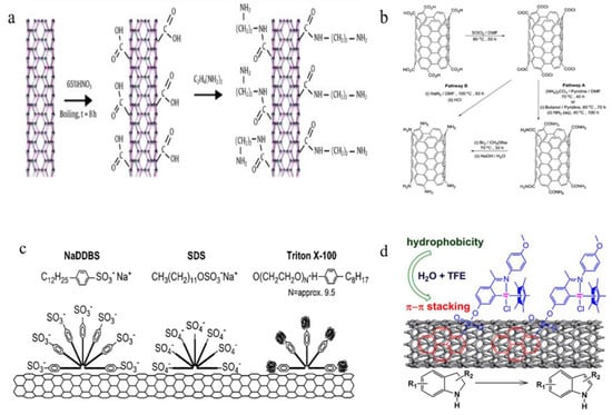 Covalent (a,b) and the non-covalent modifications (c,d) of carbon nanotubes. (a) Carboxyl functionalized carbon nanotubes. Reproduced from Phuong et al. [] by permission of Elsevier Science Ltd. (b) Amino functionalized CNT. Reproduced from Campidelli et al. [] by permission of Bentham Science Publishers.; (c) Iridium metal complex catalyst was coated on the surface of the carbon nanotubes through a non-covalent bond accumulation. Reproduced from Islam et al. [] by permission of the American Chemical Society; (d) Diagram of the surfactant adsorption on the CNT surface. Reproduced from Cui et al. [] by permission of Tech Science Press.