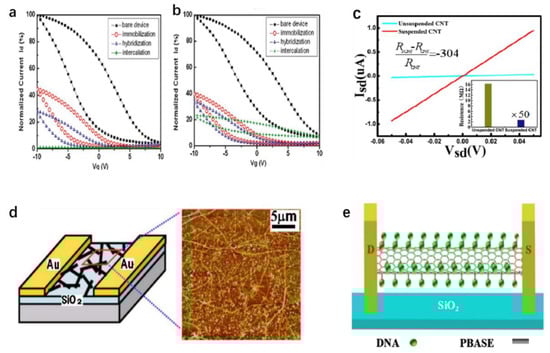 (a) Hybridized with a complementary target analyte; (b) Typical gate voltage dependence of a normalized drain current DS hybridized with a single-base mismatch target analyte; (c) Comparison of the electrical conductivity between the suspended CNT and the unsuspended CNT. In the illustration, ×50 represents the 50-fold amplification of the resistance of the suspended CNT. Reproduced from sun et al. [] by permission of Elsevier Science Ltd.; (d) Device schematics and atomic force microscope images. Reproduced from Gui et al. [] by permission of the American Institute of Physics; (e) Schemata of a SCNT-FET.