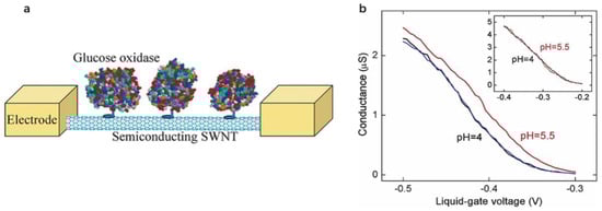 (a) semiconductor carbon nanotube device immobilized GOx enzyme; (b) the pH sensitivity diagram of the carbon nanotube sensor. At pH = 4.0 ± 0.2 (black line), then at pH = 5.5 ± 0.2 (red line), and finally at pH = 4.0 ± 0.2, the conductance of the semiconductor SWNT fixed by GOx used as the function of the liquid gate voltage (blue line). Reproduced from Koen et al. [] by permission of the American Chemical Society.