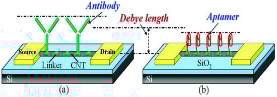 A label-free protein biosensor based on a CNT-FET: (a) antibody-modified CNT-FET; (b) Aptamer-modified CNT–FET. Reproduced from Kenzo et al. [] by permission of the American Chemical Society.