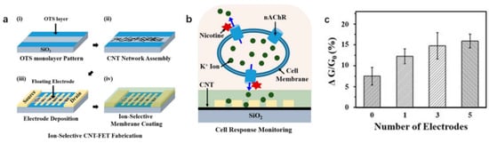 The schematic diagram describes the procedures for preparing sensors and measuring potassium ions released by living cells. Reproduced from Youngtak et al. [] by permission of Molecular Diversity Preservation International. (a) Fabrication of the ion-selective carbon nanotube field-effect transistor (CNT-FET): (i) Patternization of the octadecyl trichlorosilane (OTS) layer; (ii) Specific adhesion of the carbon nanotubes; (iii) Dynamic electrode deposition on the CNT channel; (iv) Ion-selective membrane coating. (b) Direct monitoring of the response of a single cell to nicotine using ion-selective sensors. (c) Conductivity sensitivity of sensors with different numbers of floating electrodes to a 10 nM potassium ion solution.
