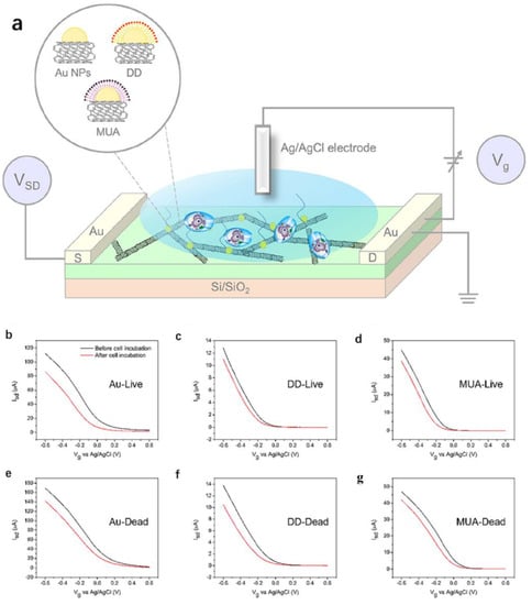 (a) The transmission characteristics of the CNT-FET, i.e., the relationship between the source-drain current (Isd) and the applied liquid gate voltage, have different decorative and liquid-gated NTFET schematics after the cell culture; (b) The transfer characteristics of NTFET were modified with bare gold nanoparticles; (c) dodecyl mercaptan; (d) 11-mercaptoundecanoic acid after the incubation in the living cells; (e) Transfer characteristics of NTFET after the incubation with bare gold nanoparticles; (f) 1-dodecanethiol; (g) 11-mercaptoundecanoic acid in dead cells. Reproduced from Liu et al. [] by permission of the American Chemical Society.
