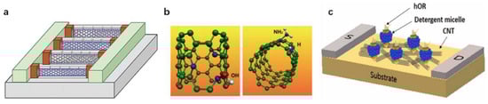 (a) Structure diagram of the doped carbon nanotubes. Reproduced from Shu et al. [] by permission of of the American Chemical Society; (b) Molecular model of the carbon nanotube, whose surface is doped with OH group (red) and NH2 group (blue) with pyridine site. Reproduced from Villalpando—Páez et al. [] by permission of Elsevier Science Ltd.; (c) Schemata of the hOR-based CNT-FET sensors for the DMMP detection. Reproduced from Jin et al. [] by permission of Elsevier Science Ltd.