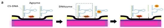 - Hu, L.; Fu, X.; Kong, G.; Yin, Y.; Meng, H.M.; Ke, G.; Zhang, X.B. DNAzyme-gold nanoparticle-based probes for biosensing and bioimaging. J. Mater. Chem. B 2020, 8, 9449–9465. [Google Scholar] [CrossRef]